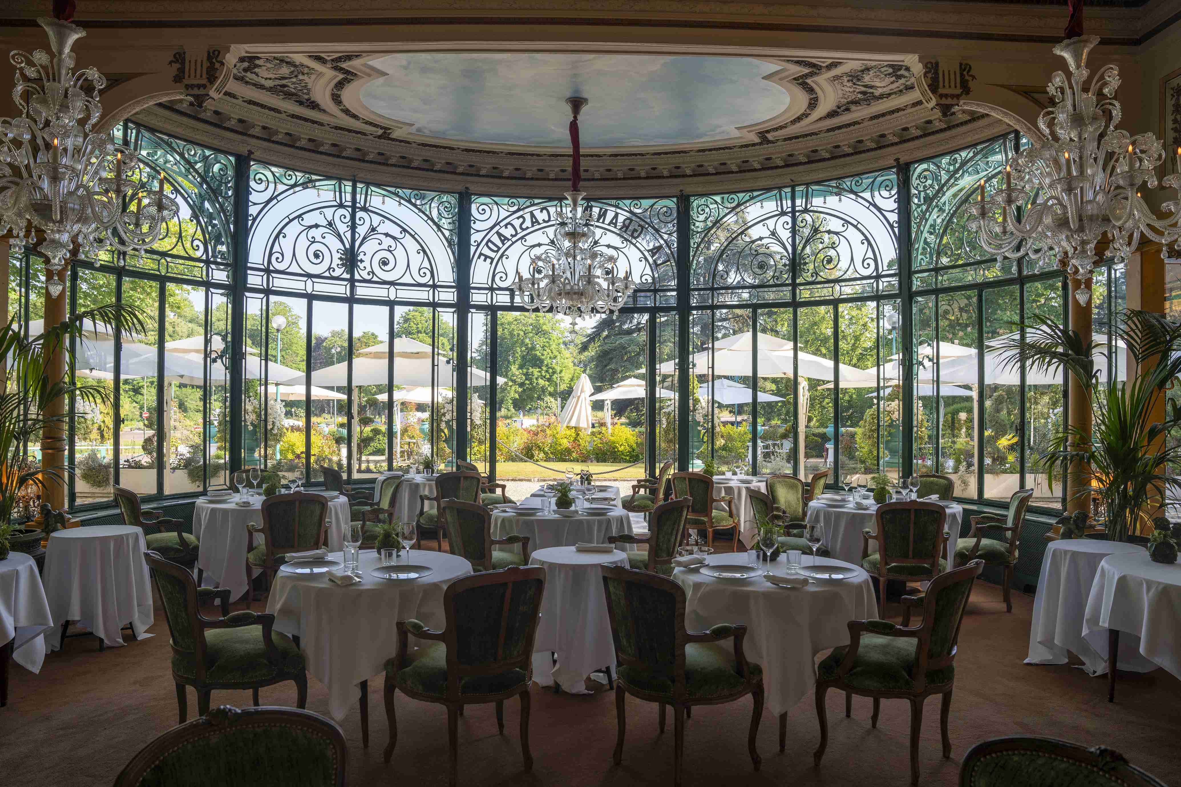 La Grande Cascade n’a pas toujours été un restaurant, ce qui explique son décor atypique et exceptionnel. Le pavillon était à l’origine un lieu de halte pour Napoléon III, qui venait au Bois de Boulogne pour chasser. Au fil des années, la Grande Cascade a évolué, tout en entretenant son style “rétro-moderne”. A l’intérieur, lustres, dorures, et miroirs offrent un charme certain à cette résidence qui a conservé toute sa splendeur d’époque. La salle, lumineuse et spacieuse, la formidable hauteur sous plafond ainsi que l’espacement des tables, font de la Grande Cascade un lieu propice à la détente et aux confidences. Un lieu parfait pour un déjeuner d’affaires ou un dîner romantique. Quant aux différents salons situés à l’étage, ils sont privatisables dans le cadre d’une réunion d’entreprise ou d’un évènement privé (Salons).